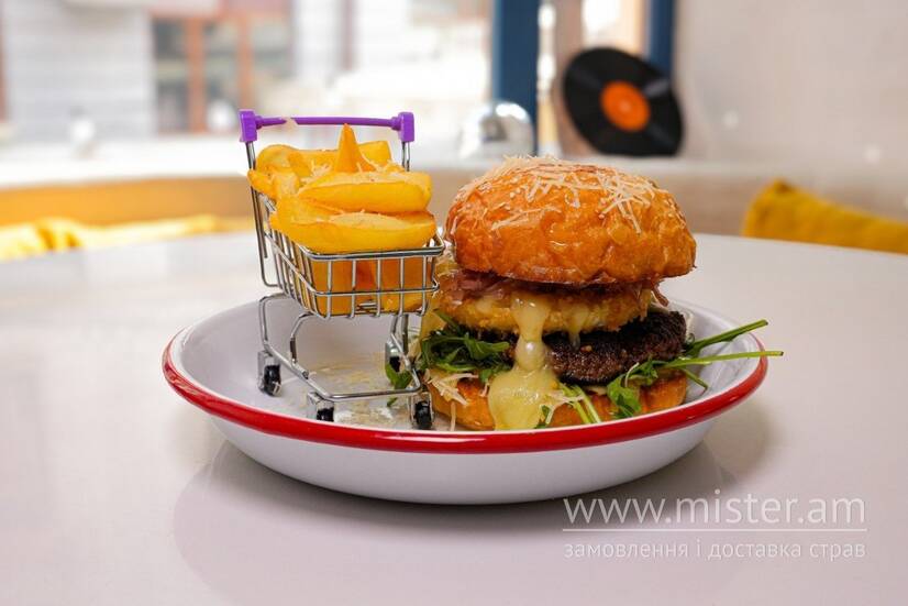 Булку самі робили, котлетос яловичий, карамелізована груша з американською гірчицею, камамбер, рукола, карамелізована цибуля + хрустка картопля.