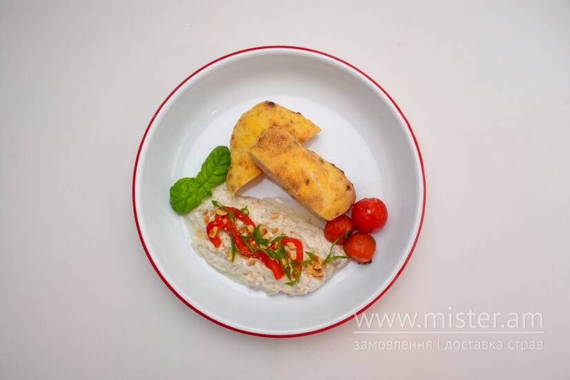 Баклажан печений, крем з фети, часник,піта, томати черрі мариновані, перець печений, олія оливкова, горіх фундук, базилік, цибуля зелена.