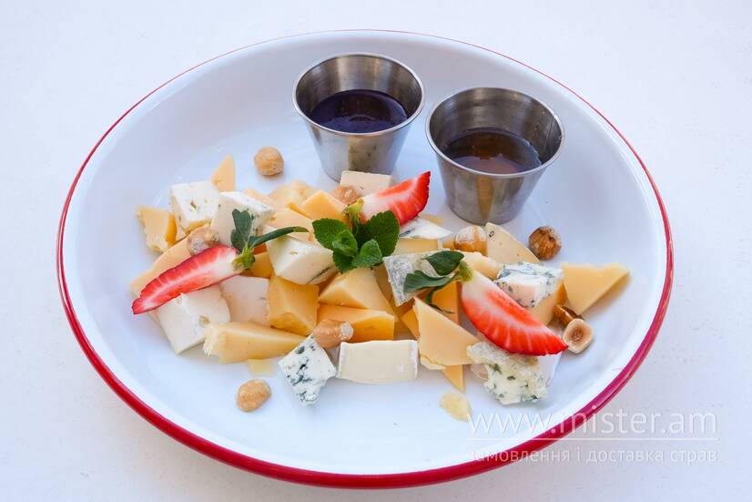 Брі, дорблю, ементалер, пармезан, горіх фундук, соус ягідний, мед, сезонні ягоди.