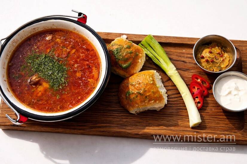 Копчене ребро, пампушки з часником, мелене сало, сметана, зелена цибуля, гострий перець.