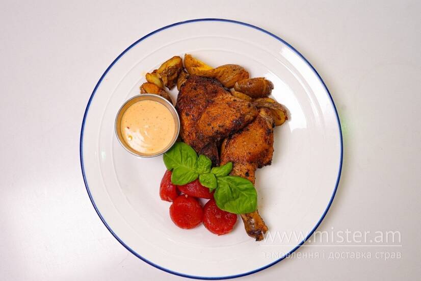 Курча, картопля молода, чері мариновані, соус пікантний.