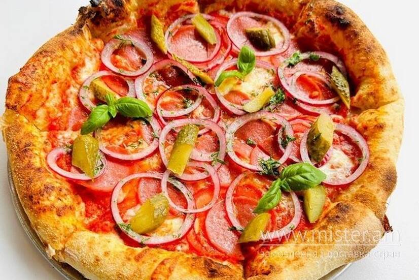Томат свіжий, ковбаса італійська, огірок маринований, маринована цибуля, моцарела, соус томатний.