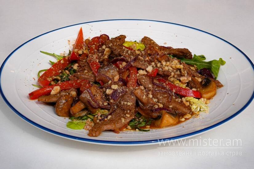 Телятина, перець болгарський, мікс салату, печериці, горіх грецький, цибуля синя.