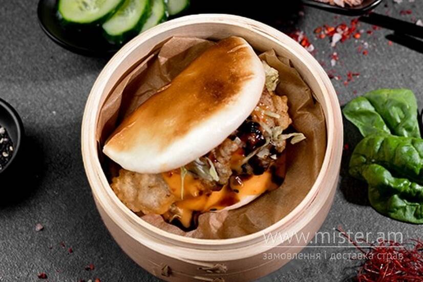 Тайванська ніжна булочка бао з соковитою тигровою креветкою, яка обсмажена в темпурі з соусом Spicy. Доповнюється огірком, цибулею фрі та соусом Unagi.