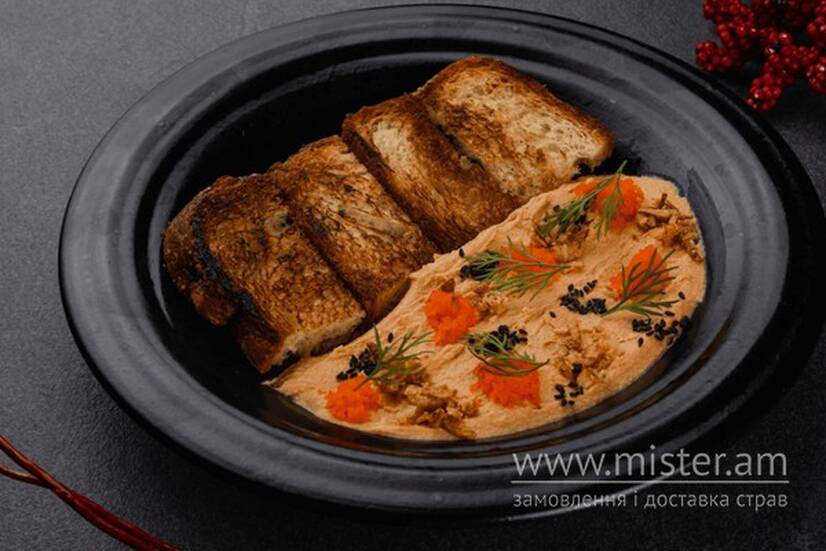Ніжний лососевий паштет, доповнений ікрою масаго, кропом та сухою цибулею. Подаємо з ароматним, підсмаженим хлібом бріош.