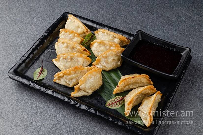 Хрусткі гьодзе з соковитою качкою, обсмажені у фритюрі до золотистої скоринки. Подаються з ароматним журавлинним соусом, що вдало підкреслює смак м`яса. Вишукана закуска з яскравим контрастом смаків.