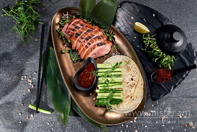 Соковита качина грудка, запечена в хоспері до ідеальної скоринки, подається з тонкими млинцями, свіжим огірком та ароматним соусом якініку-хойсин.