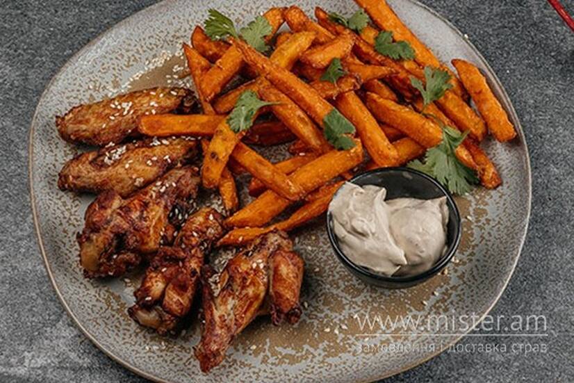 Соковиті курячі крильця та батату, обсмажені до хрусткої скоринки, подаємо з пікантним соусом дорблю-хойсін. Доповнюємо ароматною кінзою та білим кунжутом.