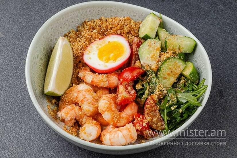 Запарений кус-кус та соковиті креветки. Рукола в оливковій олії додає свіжості, помідори чері, огірок і мариноване яйце — доповнюють смак, а скибка лимону підкреслює баланс. Завершуємо горіховим соусом і хрустким арахісом.