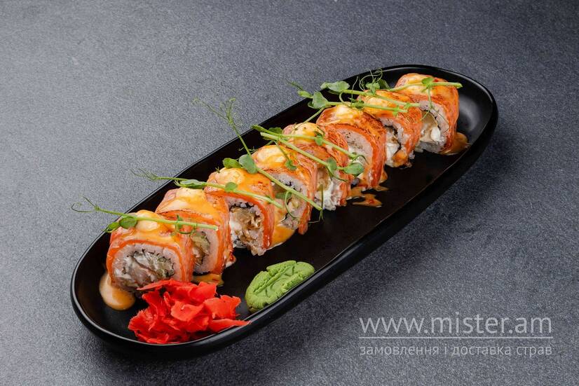 Рол з хрусткою креветкою в темпурі, свіжим огірком і Філадельфією. Покриваємо ніжним лососем, поливаємо спайсі і фірмовим соусами до креветки.