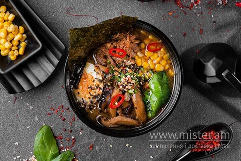 Ароматний бульйон рамен із качкою, локшиною удон, кукурудзою та грибами шиїтаке. Додаємо мариноване яйце, свіжий бебі шпинат, зелену цибулю, перець чилі, тогараші та доповнюємо хрумким листком норі.