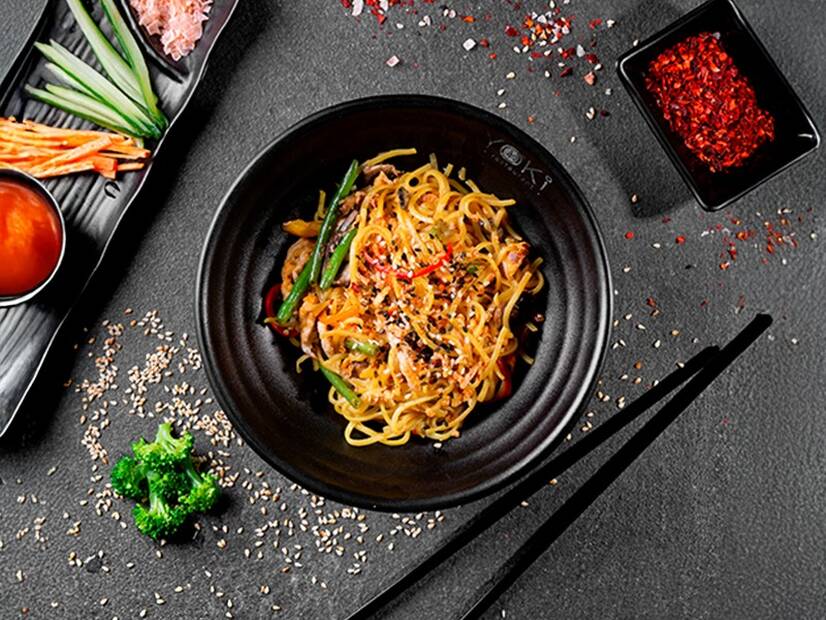 Яєчна локшина з обсмаженими броколі, стручковою квасолею, перцем Капі, морквою, печерицями та ніжним яйцем-скрамбл. Завершуємо соусом Teriyaki та додаємо тогараші