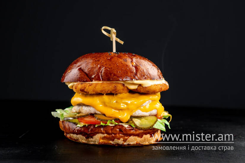 Велика булочка бріош, 2 х котлети курячі, 2 х сир Чеддер, огірок, томат, салат, цибулеві кільця, соус сирний.