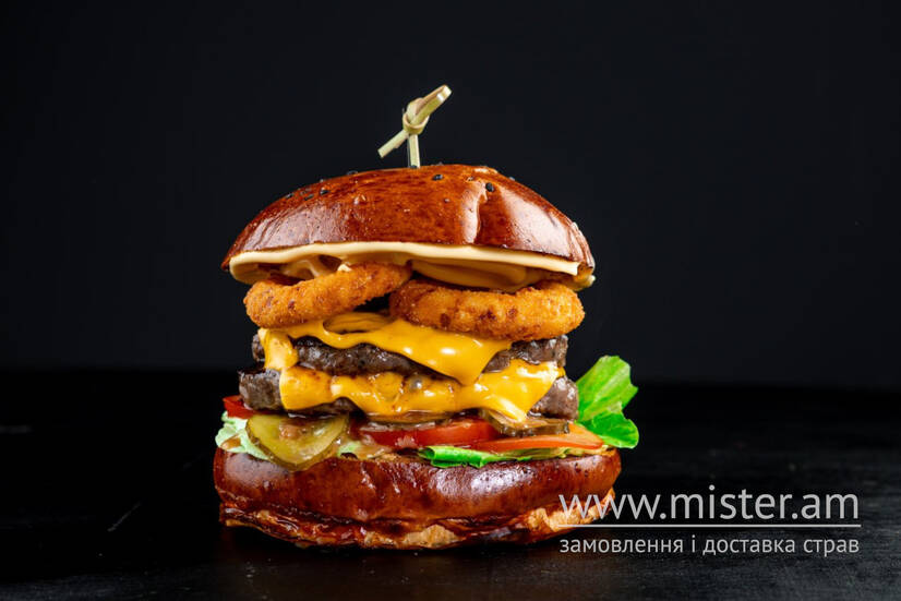 Велика булочка бріош, 2 х котлети з яловичини, 2 х сир Чеддер, огірок, томат, салат, цибулеві кільця, соус сирний.