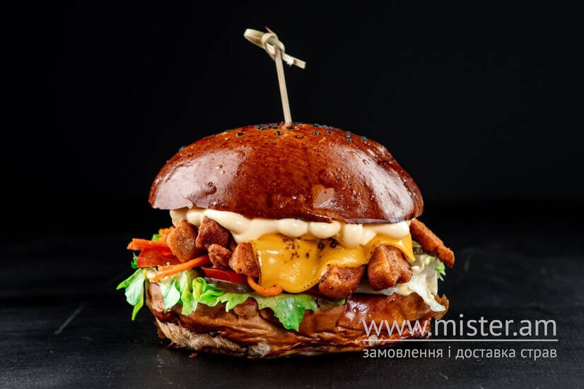 Велика булочка бріош, стріпси курячі, сир Чеддер, огірок, томат, салат, маринована морква, соус сирний.