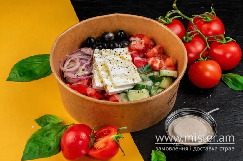 Салат айзберг, томат, свіжий огірок, перець болгарський, сир фета, оливки, цибуля синя, фірмовий соус.