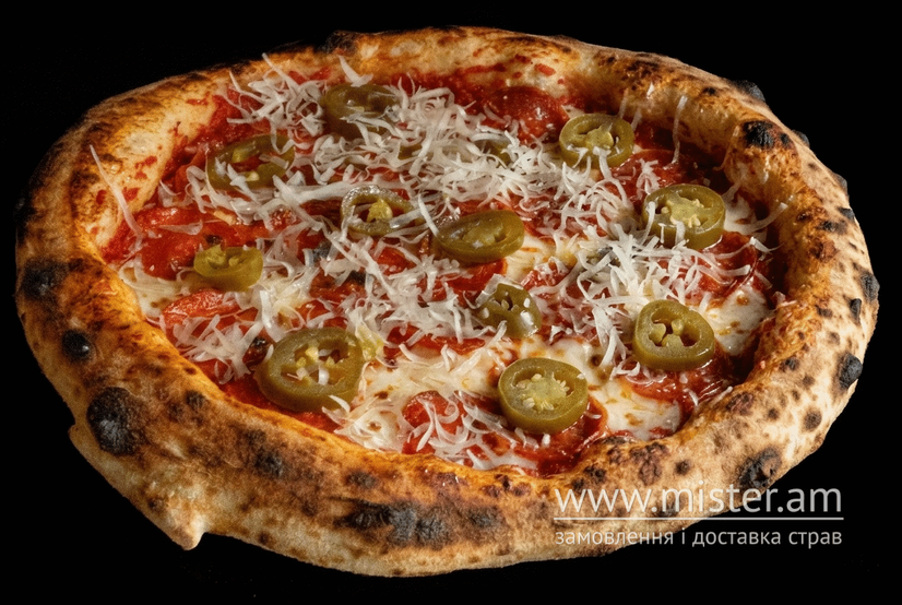 Ферментоване тісто на заквасці, фірмовий томатний соус, моцарела, ковбаса папероні, перець халапеньйо, пармезан