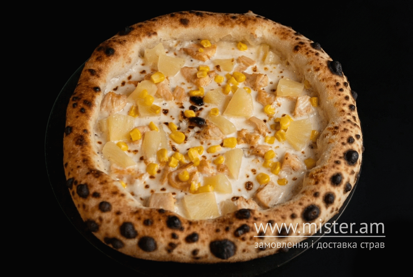 Ферментоване тісто на заквасці, фірмовий вершковий соус, моцарела, курка, ананас, кукурудза