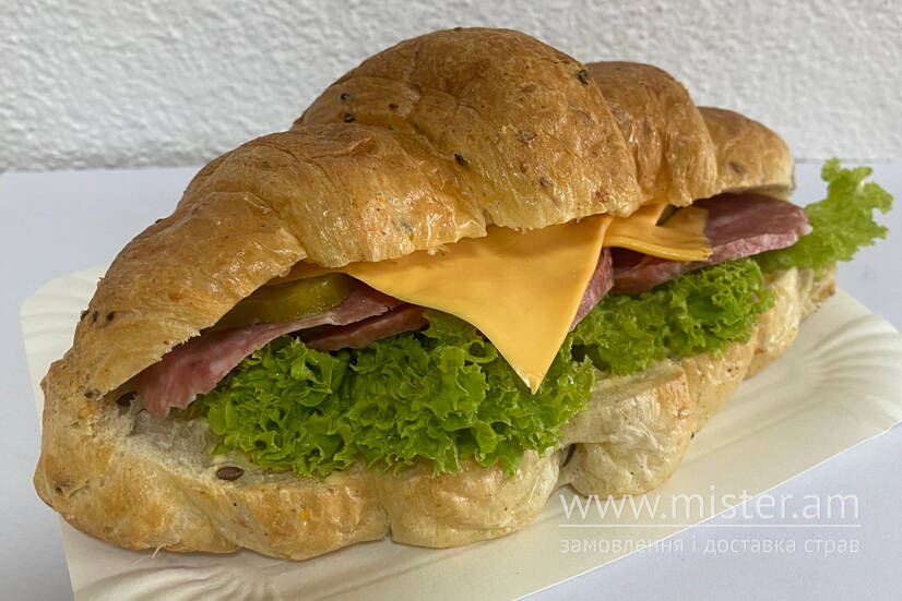 Круасан, соус сирний, салата, огірок квашений, салямі, сир.