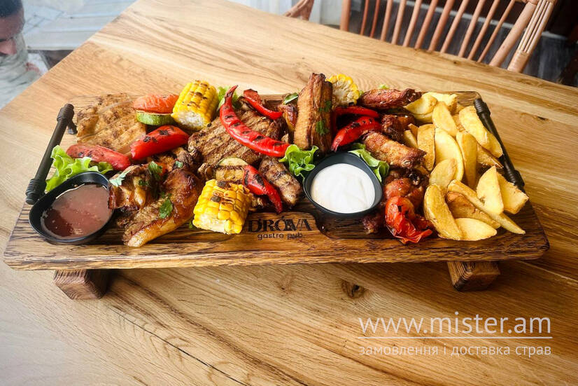 Курячий стейк, стейк зі свиннини, ковбаски, курячі крильця, овочі гриль, картопля, соуси.