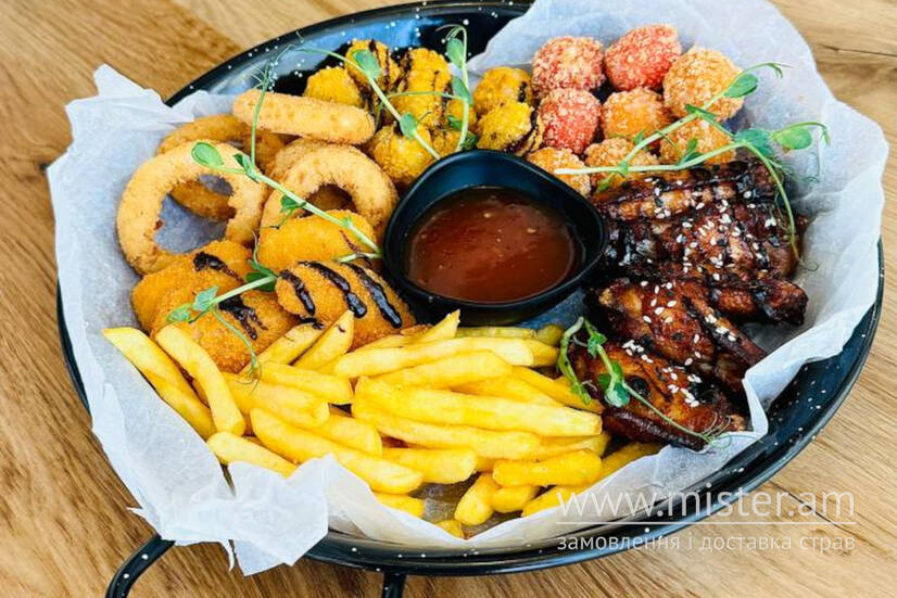 Нагетси, курячі кульки, крила, цибулеві кільця, фрі, сирні кульки, кетчуп.