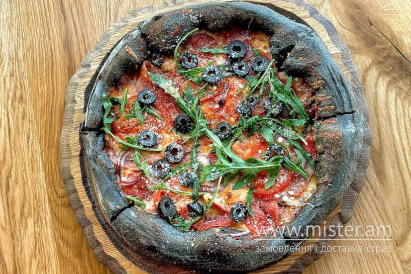 Чорна основа, неаполітанський соус, сир моцарела, шинка,бекон, салямі, цибуля червона, помідори, рукола, оливки, пармезан, мисливські ковбаски.