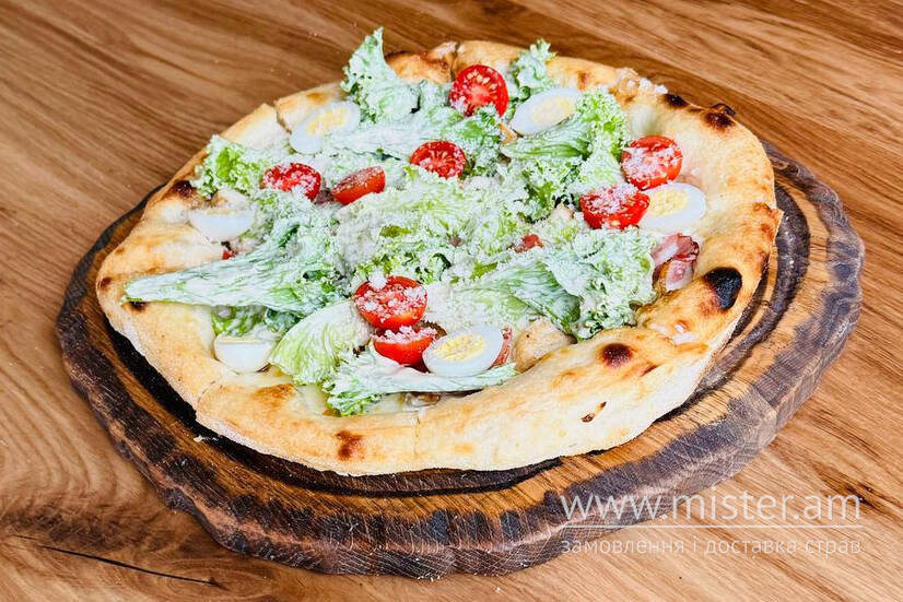 Вершковий соус, сир моцарела, сир пармезан, бекон, курка, соус цезар, чері, салат айсберг.