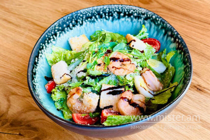 Креветки, мікс салату, чері, яйця перепелині, пармезан, соус, грінки.