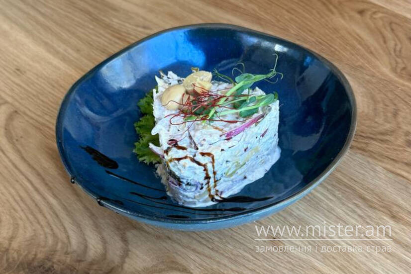 М'ясо, печериці мариновані, цибуля, огірок квашений, гірчиця, гірчиця, майонез.