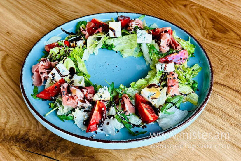 Мікс салату, чері, прошуто, сир дорблю, соус.