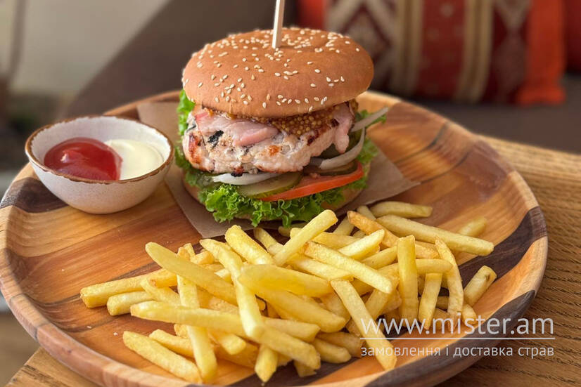 В бургер входять червона булочка, вирізка теляча, філе куряче, листя салату, помідор, цибуля, маринований огірок, перець чілі, соус устричний, соус.