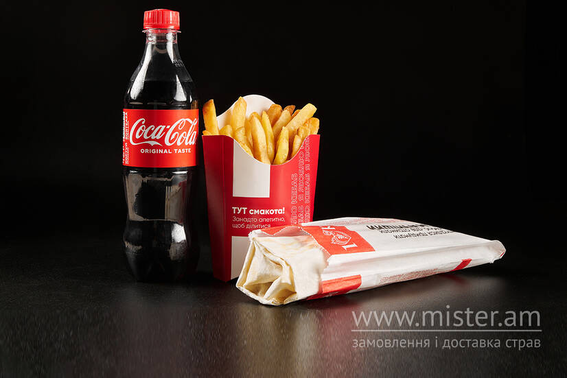 Кебаб часниковий XXL, картопля фрі L, вода в асортименті.