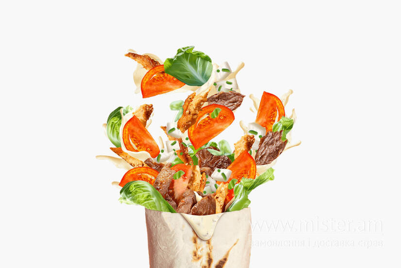 Лаваш, м'ясо курки, листя салату, помідор, цибуля, часниковий соус.