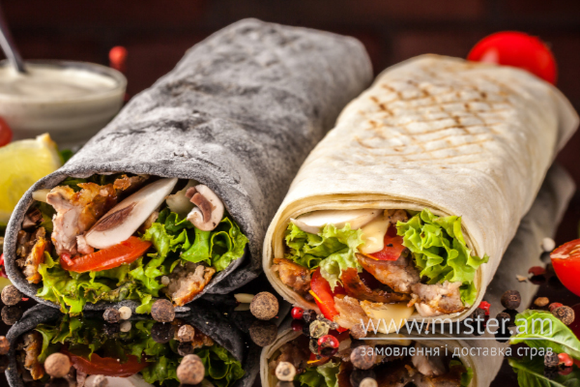 М'ясо на вибір, листя салату, помідор, цибуля, тостовий сир, печериці, соус.