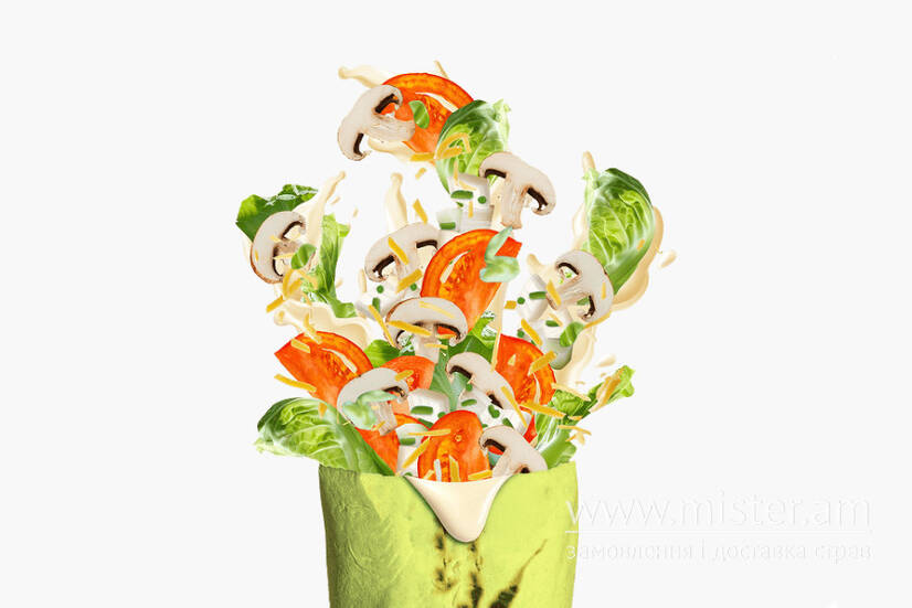 Ніжний твердий сир, свіжі помідори, салат “Айсберг”, цибуля та печериці, соус, загорнуті в лаваш.