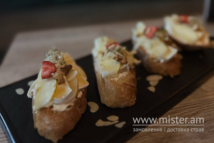 Багет, сир камамбер, груша ,мед, горіхи, базилік та оливкова олія.