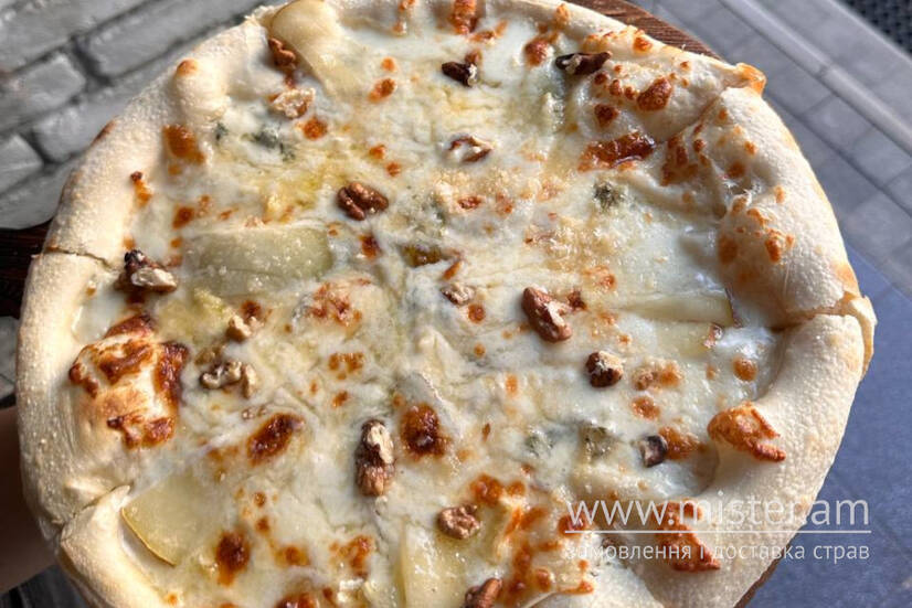 Соус вершковий, груша, волоський горіх, мед, камамбер, лазур, моцарела, пармезан.