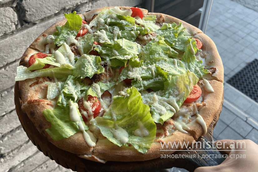 Вершковий соус, бекон, куряче філе, мікс салату, соус цезар, пармезан, томати чері.
