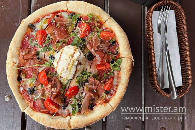 Соус неополітано, салямі, прошуто, оливки, томати, моцарела, сир фета.
