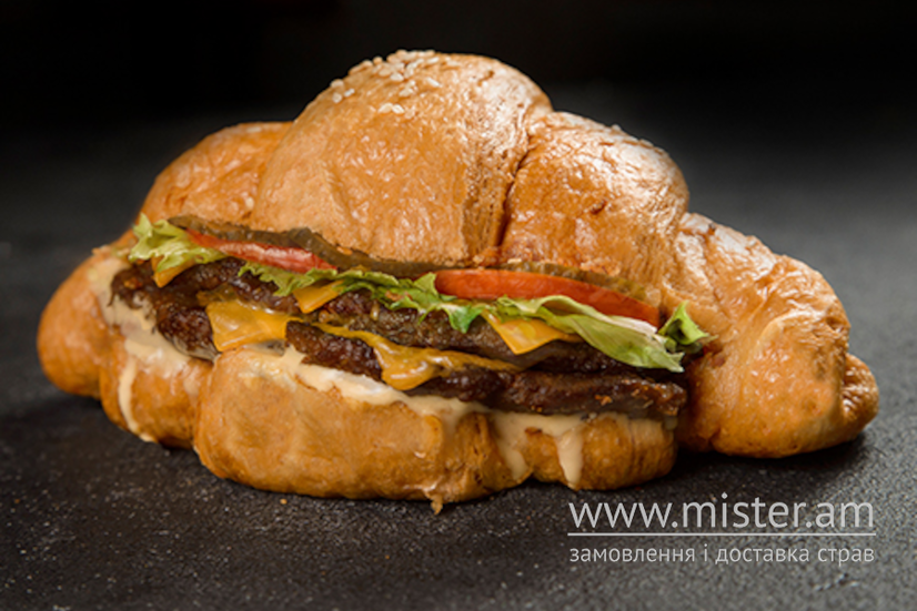 круасан, яловича котлета, сир тостовий, салат Айсберг, помідор, квашений огірок, цибуля сушена, соус Папрік-айолі