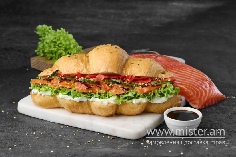 Круасан, соус крем-сир класичний, салат Лолло Біонда, лосось слабосолений, соус Теріякі, огірок свіжий, імбир маринований.