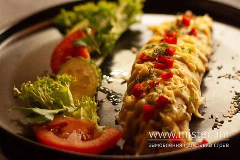 М’який, повітряний омлет, який обгортає соковите куряче м'ясо, ароматні печериці та ніжну цибулю.