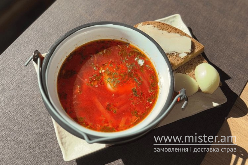 Класичний буряковий бульйон з капустою, картоплею , приправлений ароматними спеціями.