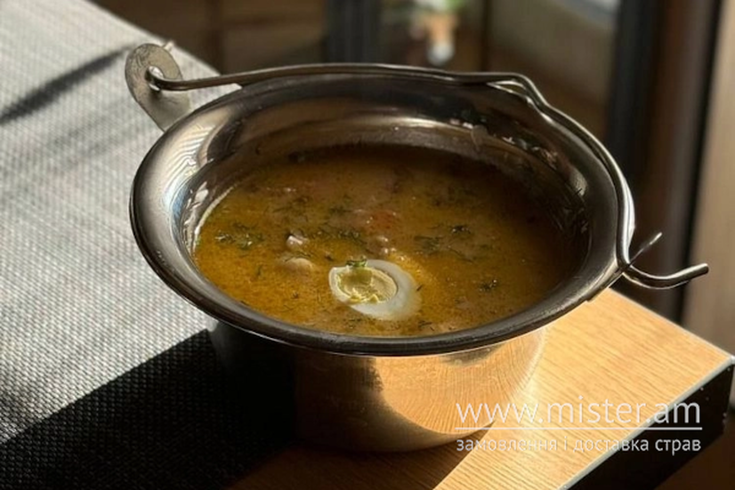 М'ясо, печериці, фасоля стручкова, бекон, картопля, цибуля, морква, паприка солодка та гостра, перепелине яйце, домашні ковбаски.