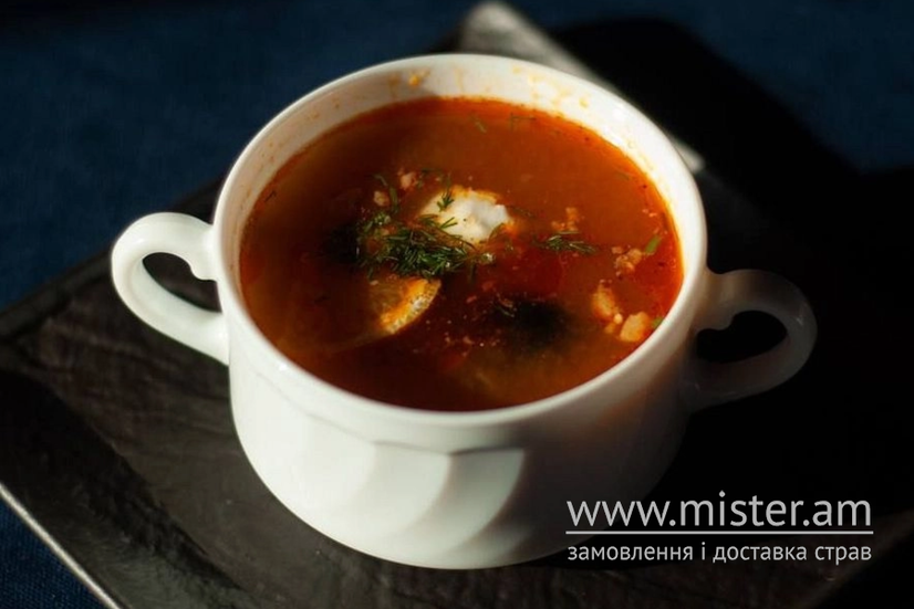 Наваристий суп на бульйоні з м'ясом, ковбасами та солоними огірками, доповнений оливками та лимоном. Має насичений, кисло-солоний смак, який чудово підкреслюється прянощами та зеленню. Ідеальна страва для тих, хто любить яскраві та насичені аромати.