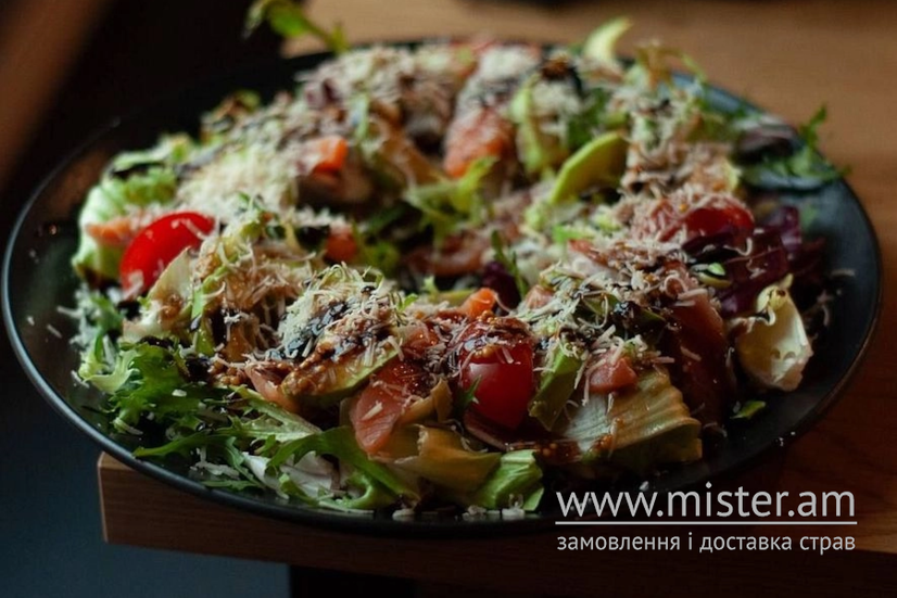 Ніжні шматочки червоної риби в поєднанні з м'яким авокадо, свіжим міксом салату та ароматним пармезаном, що додає неповторного смаку. Усе це полите бальзамічним соусом, що додає страві гармонійної кисло-солодкої нотки, роблячи кожен укус вишуканим і свіжим.