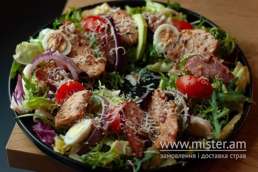 Ніжне авокадо в поєднанні з соковитою куркою, ароматним бочком, перепелиними яйцями та тонко нарізаною синьою цибулею. Мікс салату додає свіжості, а разом із легким соусом ця страва дарує гармонію смаків, де кожен інгредієнт розкривається в новій і неповторній нотці.
