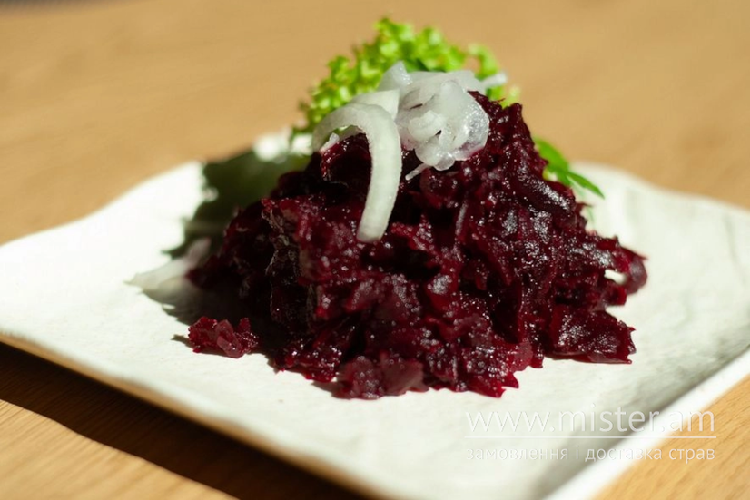 Смачний салат з вареного буряка, доповнений цибулею заправлений сумішшю олії та оцту.