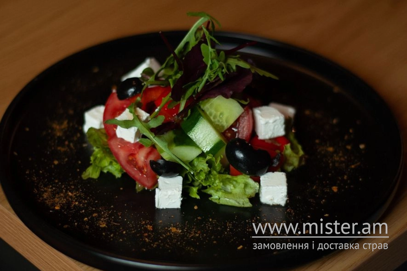 Свіжий салат з маслинами, сиром фета, помідорами, огірками та болгарським перцем. Заправлений фірмовим соусом.
