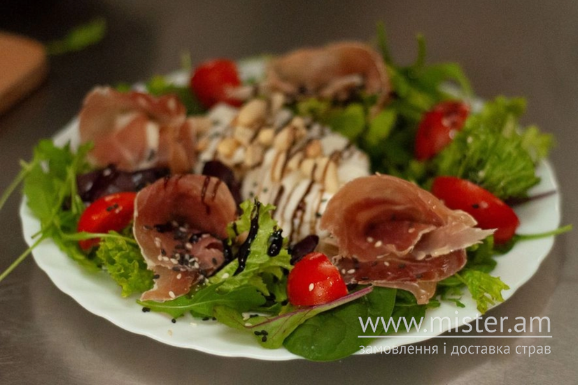 Легкий та ароматний салат з помідорів чері, руколою, горішками, хамоном та ніжною моцарелою, заправлений кисло-солодким соусом. Свіже та смачне поєднання інгредієнтів з яскравим смаком.